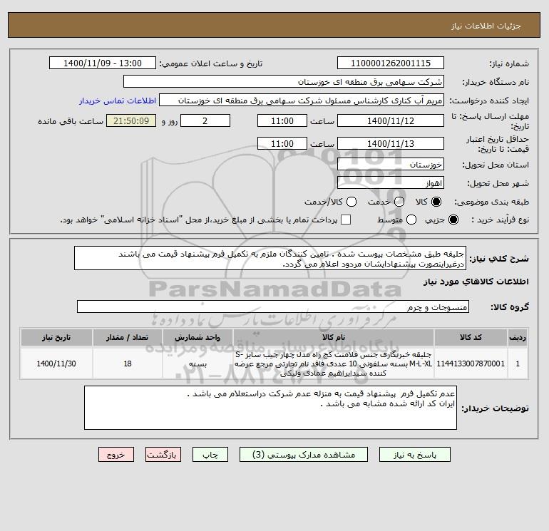 شرح کلی نیاز: جلیقه طبق مشخصات پیوست شده . تامین کنندگان ملزم به تکمیل فرم پیشنهاد قیمت می باشند درغیراینصورت پیشنهادایشان مردود اعلام می گردد.