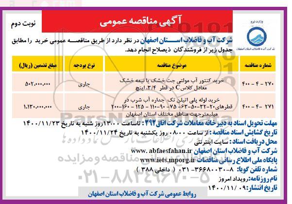 شرکت آب و فاضلاب استان اصفهان در نظر دارد از طریق مناقصه عمومی خرید را مطابق جدول زیر از فروشندگان ذیصلاح انجام دهد