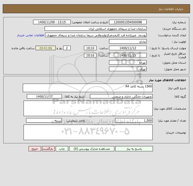 شرح کلی نیاز: 1500 بسته کاغذ A4