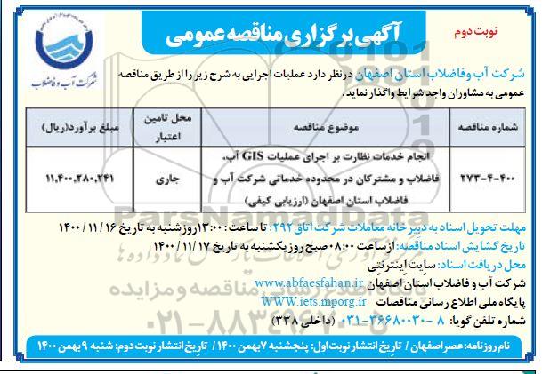 | 400-4-273 | انجام خدمات نظارت بر اجرای عملیات GIS آب ، فاضلاب و مشترکان در محدوده خدماتی شرکت آب و فاضلا استان اصفهان ارزیابی کیف ی | جاری | 11.400.280.241 |