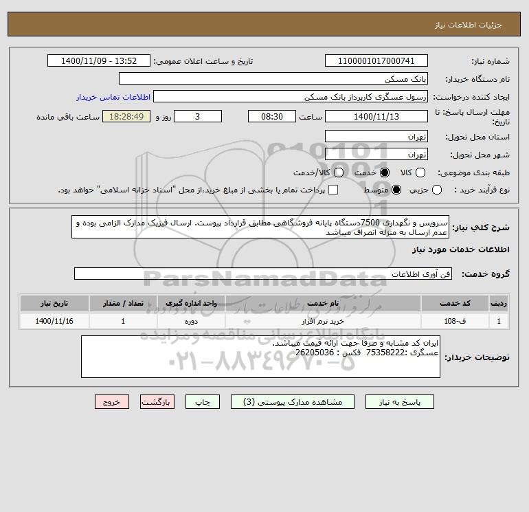 شرح کلی نیاز: سرویس و نگهداری 7500دستگاه پایانه فروشگاهی مطابق قرارداد پیوست. ارسال فیزیک مدارک الزامی بوده و عدم ارسال به منزله انصراف میباشد