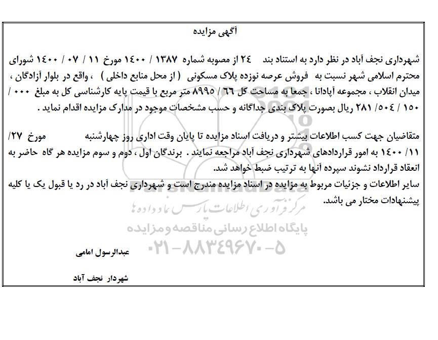 مزایده عمومی مزایده فروش عرصه نوزده پلاک مسکونی برگزار میگردد. از کلیه افراد متخصص و شرکتهای واجد شرایط دعوت به عمل میآید تا در این مزایده با کد خبرگزاری پارس نماد : 4207006 شرکت نمایند تاریخ شروع مزایده : 1400/11/09 مهلت شرکت در مزایده: تا پایان روز 1400/11/27 مکان برگزاری اموال واگذاری استانهای اصفهان و دستهبندیهای مربوط به این حراجی املاک و زمین میباشد.