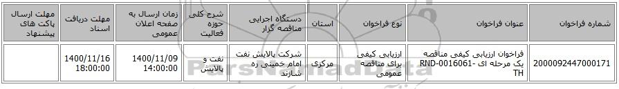 | 2000092447000171 | فراخوان ارزیابی کیفی مناقصه یک مرحله ای RND-0016061-TH | ارزیابی کیفی برای مناقصه عمومی | مرکزی | شرکت پالایش نفت امام خمینی ره شازند | نفت و پالایش | 1400/11/09 14:00:00 | 1400/11/16 18:00:00 |