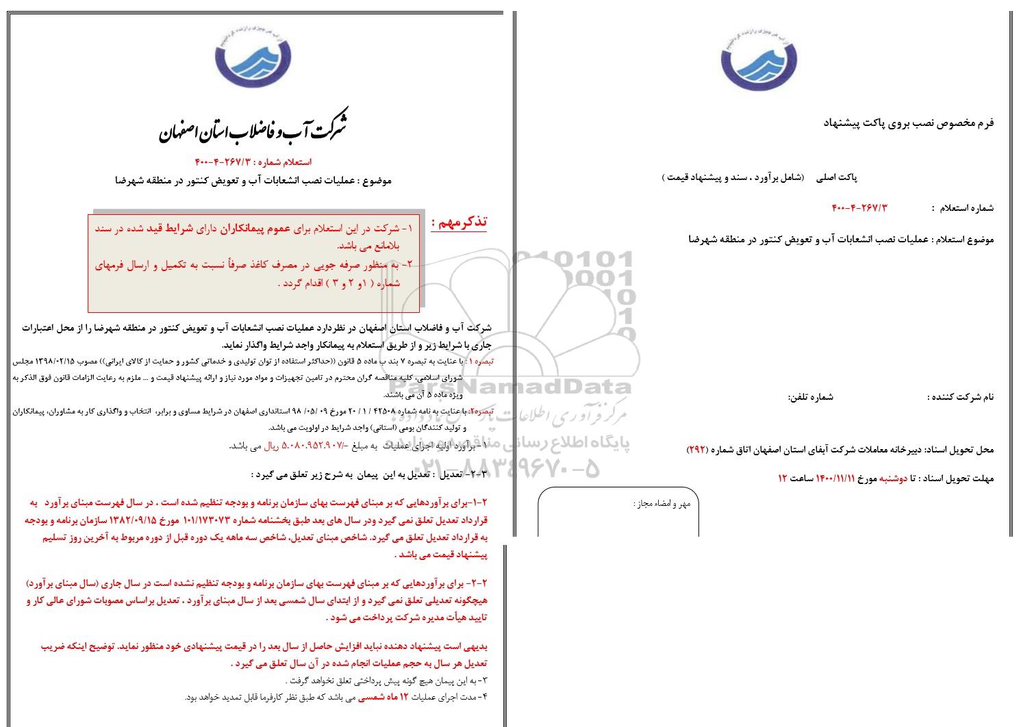 شرکت آب و فاضلاب استان اصفهان در نظر دارد عملیات نصب انشعابات آب و تعویض کنتور در منطقه شهرضا را از محل اعتبارات جاری با شرایط زیر و از طریق استعلام به پیمانکار واجد شرایط واگذار نماید.