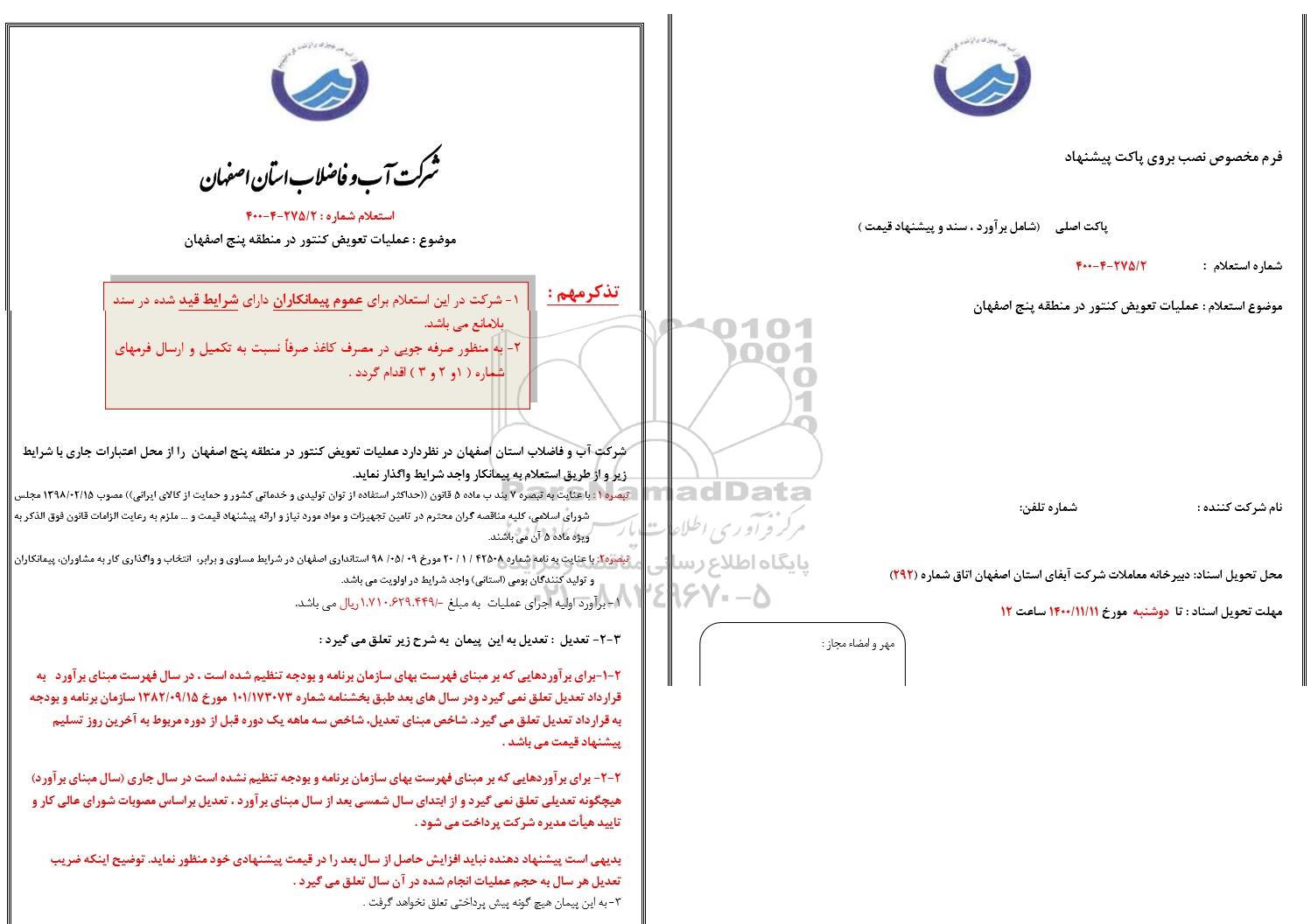 شرکت آب و فاضلاب استان اصفهان در نظر دارد عملیات تعویض کنتور در منطقه 5 اصفهان را از محل اعتبارات جاری با شرایط زیر و از طریق استعلام به پیمانکار واجد شرایط واگذار نماید