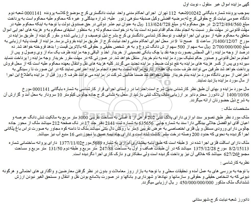 مال مورد مزایده و بهای آن طبق نظر کارشناس بدین شرح است:احتراما در راستای اجرای قرار کارشناسی به شماره بایگانی 0001141 مورخ 1400/10/06 آن دادورز محترم دایر بر ارزیابی ملک پلاک ثبتی بازدید از محل به نشانی کرج جاده چالوس کیلومتر 10 سرودار به محل آمد و گزارش آن به شرح ذیل حضورتان ارائه میگردد.