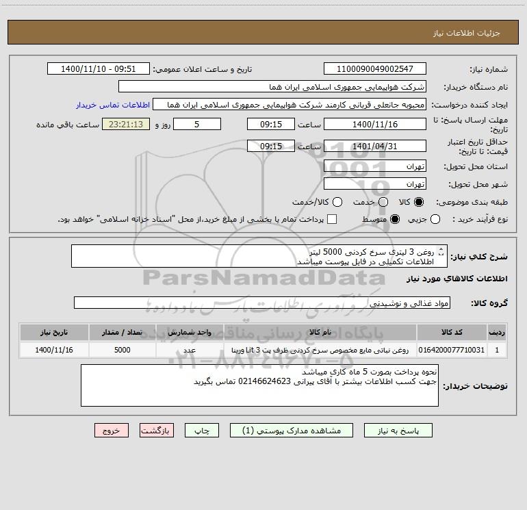 شرح کلی نیاز: روغن 3 لیتری سرخ کردنی 5000 لیتر