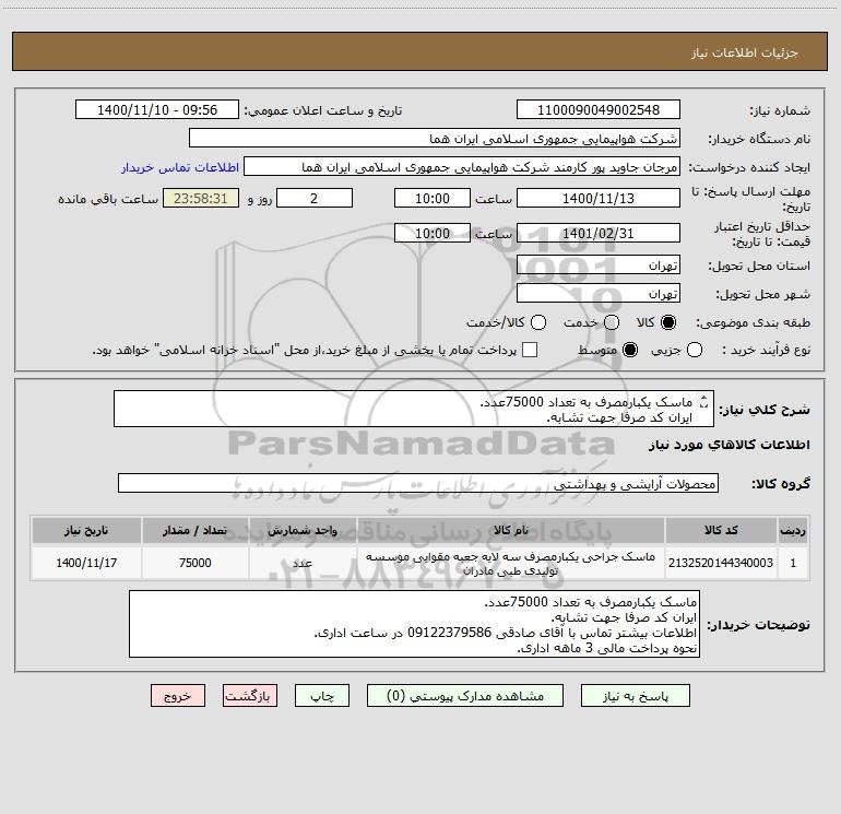 شرح کلی نیاز: ماسک یکبارمصرف به تعداد 75000عدد. ایران کد صرفا جهت تشابه. اطلاعات بیشتر توضیحات مطالعه شود.