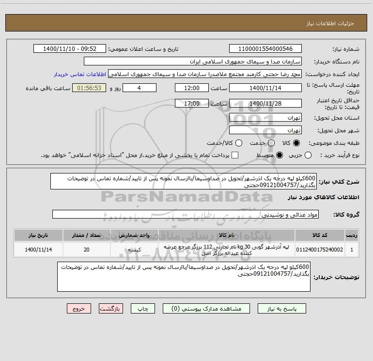 شرح کلی نیاز: 600کیلو لپه درجه یک اذرشهر/تحویل در صداوسیما/باارسال نمونه پس از تایید/شماره تماس در توضیحات بگذارید/09121004757حجتی