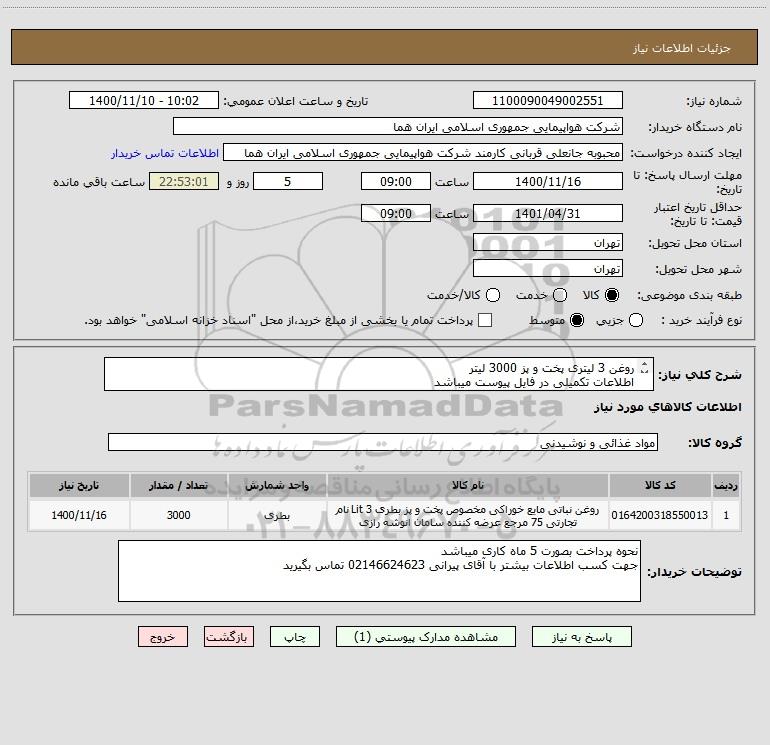 شرح کلی نیاز: روغن 3 لیتری پخت و پز 3000 لیتر اطلاعات تکمیلی در فایل پیوست میباشد ایران کد جهت تشابه میباشد