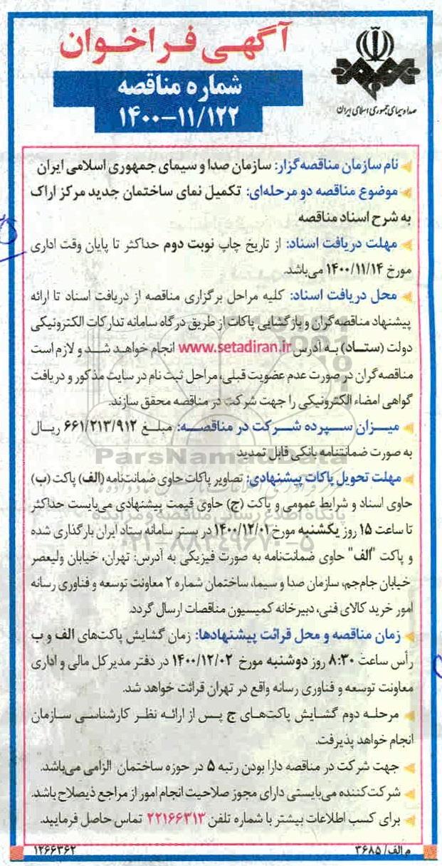 - نام سازمان مناقصه گزار: سازمان صدا و سیمای جمهوری اسلامی ایران