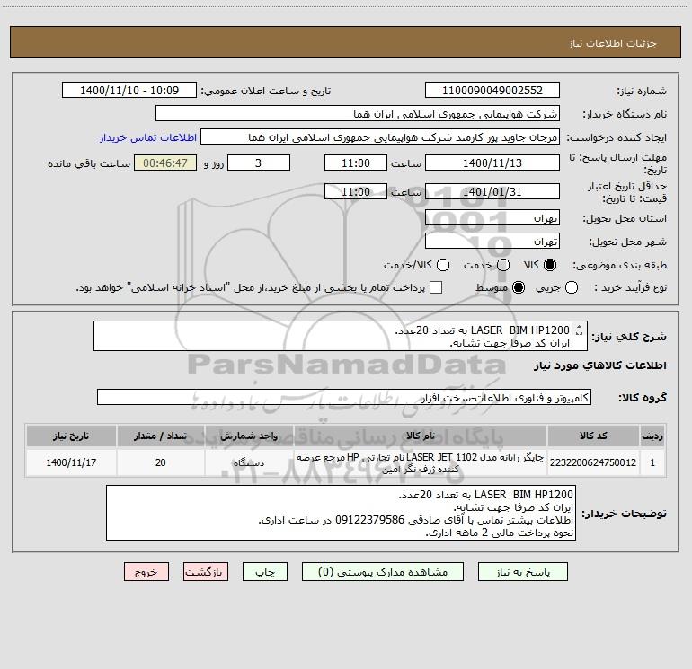 استعلام LASER BIM HP1200 به تعداد 20عدد. ایران کد صرفا جهت تشابه. اطلاعات بیشتر توضیحات مطالعه شود., استعلام LASER BIM HP1200 به تعداد 20عدد. ایران کد صرفا جهت تشابه. اطلاعات بیشتر توضیحات مطالعه شود.