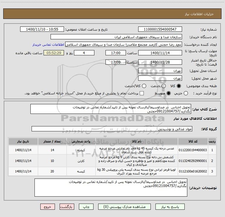 شرح کلی نیاز: تحویل اجناس در صداوسیما/باارسال نمونه پس از تایید/شماره تماس در توضیحات بگذارید/09121004757حجتی