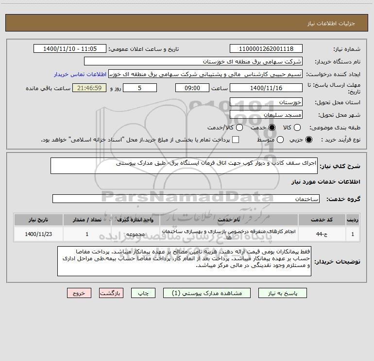 شرح کلی نیاز: اجرای سقف کاذب و دیوار کوب جهت اتاق فرمان ایستگاه برق- طبق مدارک پیوستی
