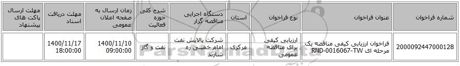 | 2000092447000128 | فراخوان ارزیابی کیفی مناقصه یک مرحله ای RND-0016067-TW | ارزیابی کیفی برای مناقصه عمومی | مرکزی | شرکت پالایش نفت امام خمینی ره شازند | نفت و گاز | 1400/11/10 09:00:00 | 1400/11/17 18:00:00 |