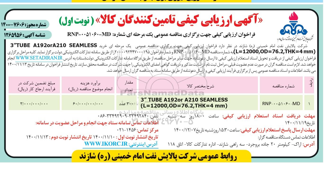 ارزیابی کیفی TUBE A192orA210 SEAMLESS از کلیه افراد متخصص و شرکتها واجد شرایط دعوت به عمل میآید در مناقصه با کد خبرگزاری پارس نماد: 4210019 شرکت نمایند.