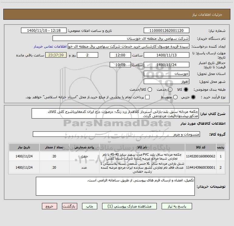 استعلام چکمه مردانه ستق بلند-بارانی آستردار کلاهدار زرد رنگ- درصورت درج ایران کدمغایرباشرح کلی کالای مذکور،پیشنهادقیمت مردودمی گردد., استعلام چکمه مردانه ستق بلند-بارانی آستردار کلاهدار زرد رنگ- درصورت درج ایران کدمغایرباشرح کلی کالای مذکور،پیشنهادقیمت مردودمی گردد.