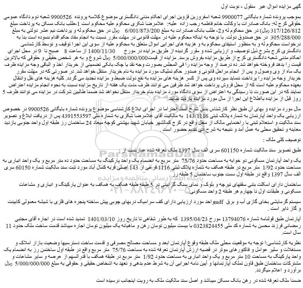 مال مورد مزایده و بهای آن طبق نظر کارشناس بدین شرح است:احتراما در اجرای ابلاغ کارشناسی موضوع پرونده شماره بایگانی 9900526 در خصوص ارزیابی یک واحد آپارتمان به شماره پلاک ثبتی 143/1116 به مالکیت آقای غلامرضا شکری به شماره ملی 4391553597 پس از دریافت ابلاغ و تصویر سند مالکیت و استعلام ثبتی با راخنمایی مالک از محل واقع در کرج کمالشهر خیابان شهید بهشتی کوچه میعاد 24 ساختمان رز طبقه اول واحد جنوبی بازدید معاینه و تحقیق محلی به عمل آمد و نتیجه به شرح آتی تقدیم حضور است .