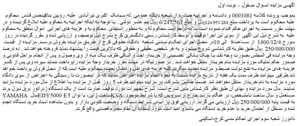 بموجب پرونده کلاسه 0001081 و دادنامه و اجراییه صادره از شعبه دادگاه عمومی له:سیامک اکبری تیرآبادی علیه: رویین بنامحمدحسن قدس محکوم علیه محکوم است به پرداخت مبلغ 124/951/264ریال و مبلغ 6/247/563 ریال نیم عشر دولتی . با توجه به اینکه اجراییه به محکوم علیه ابلاغ گردیده و در مهلت مقرر نسبت به اجرای حکم اقدام ننموده است بنا به درخواست محکوم له و به منظور استیفای محکوم به و هزینه های اجرایی اموال متعلق به محکوم علیه به شرح ذیل این اگهی از سوی این اجرا توقیف و توسط کارشناس رسمی دادگستری کرج بشرح ذیل توصیف و ارزیابی شده و مقرر گردیده در روز مورخ 1400/12/4 از ساعت9 الی 10در محل اجرای احکام مدنی شعبه دادگاه حقوقی کرج از طریق مزایده بفروش برسد. مزایده از قیمت 250/000/000 ریال طبق نظریه کارشناسی شروع میشود و به هر شخص حقیقی و حقوقی که بالاترین قیمت را پیشنهاد نماید فروخته خواهد شد . ده درصد وجه مزایده فی المجلس بصورت وجه نقد یا چک بانکی تضمینی از خریدار اخذ و الباقی ظرف یک ماه از وی وصول و پس از انجام مراحل قانونی و صدور حکم تملیک مورد مزایده بنام خریدار منتقل خواهد شد . در صورتیکه در مهلت مقرر خریدار وجه مزایده راپرداخت ننماید سپرده وی پس از کسر هزینه های مزایده به نفع دولت ضبط و مزایده تجدید میگردد.کلیه هزینه های نقل و انتقال بعهده محکوم علیه است.که از محل فروش پرداخت خواهد شد.طرفین میتوانند ظرف مدت یک هفته از تاریخ مزایده نسبت به نحوه انجام مزایده اعتراض نمایند که در اینصورت تا رسیدگی به اعتراض از سوی دادگاه مورد مزایده به نام خریدار منتقل نخواهد شد. ضمناً طالبین بشرکت در مزایده میتوانند ظرف 5 روز قبل از مزایده با اطلاع از مال مورد مزایده بازدید نمایند. مال مورد مزایده و بهای آن طبق نظر کارشناس بدین شرح است: شرح تجهیزات مورد توقیف عبارت است از یک دستگاه ژنراتور برق دیزل برند YAMAHA مدل EDY5000 E ساخت ژاپن، با توان 5KVA مستعمل و سال ساخت نامشخص، در هنگام بازدید خارج از سرویس که با شرایط موجود به قیمت پایه 250/000/000 ریال ارزیابی می گردد. ارزیابی فوق بر اساس شرایط دستگاه و وضعیت کنونی بازار و بدون مشاهده اسناد خرید دستگاه انجام شده و مستقل از احتمال خرید یا عدم خرید دستگاه می باشد و امید است مورد استفاده آن مقام محترم قضایی واقع گردد.