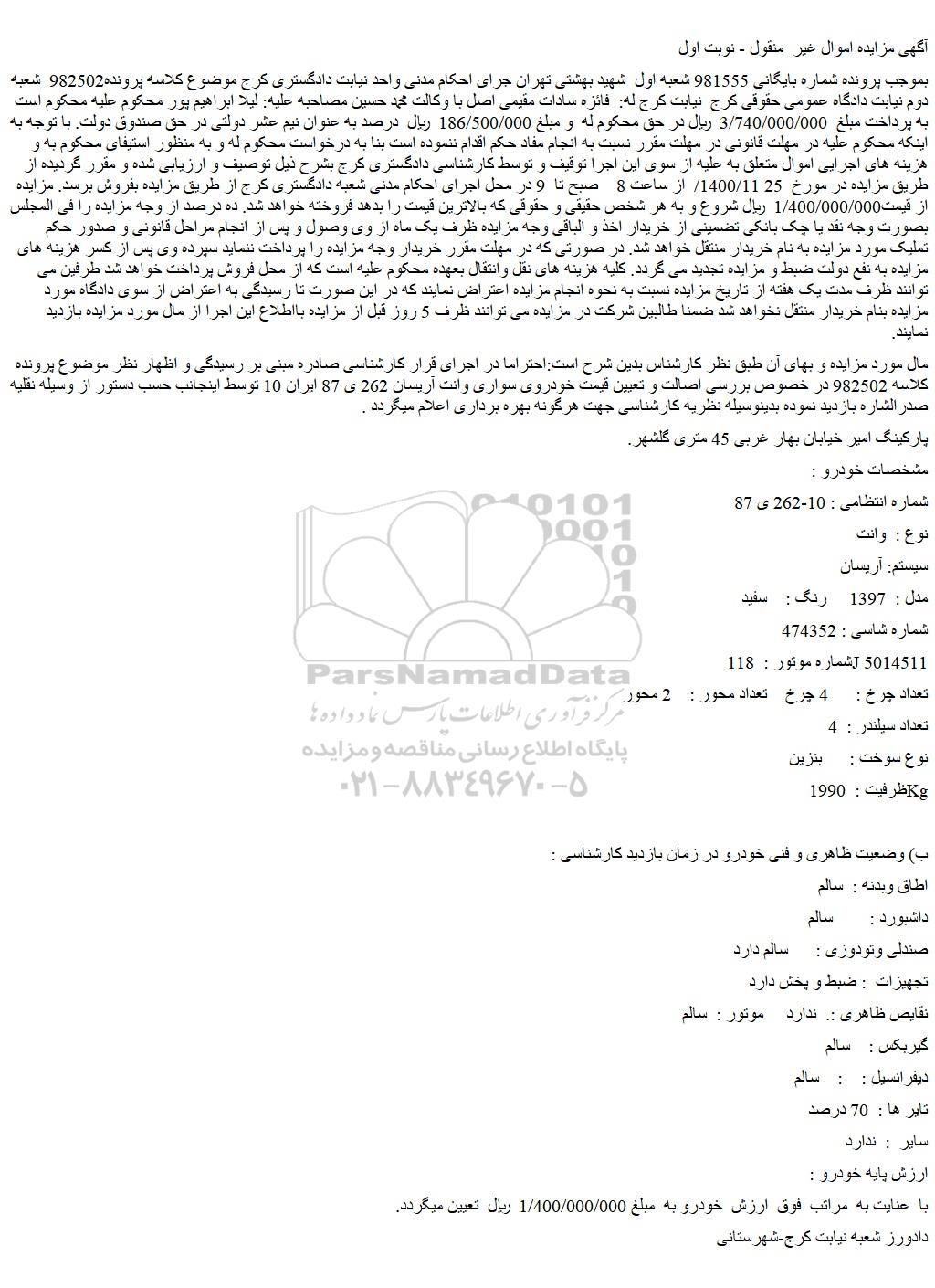 مال مورد مزایده و بهای آن طبق نظر کارشناس بدین شرح است:احتراما در اجرای قرار کارشناسی صادره مبنی بر رسیدگی و اظهار نظر موضوع پرونده کلاسه 982502 در خصوص بررسی اصالت و تعیین قیمت خودروی سواری وانت آریسان 262 ی 87 ایران 10 توسط اینجانب حسب دستور از وسیله نقلیه صدرالشاره بازدید نموده بدینوسیله نظریه کارشناسی جهت هرگونه بهره برداری اعلام میگردد .