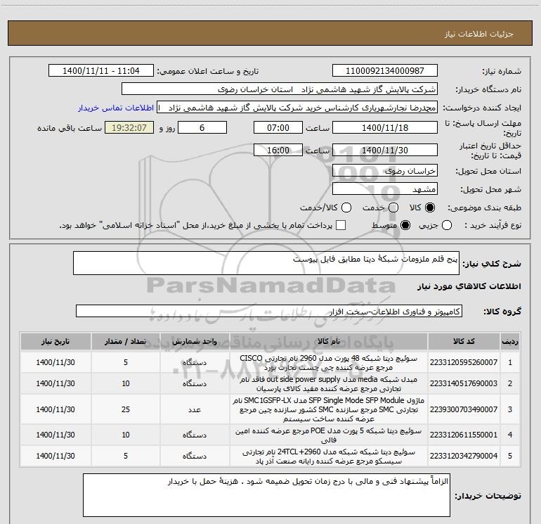 نام دستگاه خریدار:شرکت پالایش گاز شهید هاشمی نژاد استان خراسان رضوی