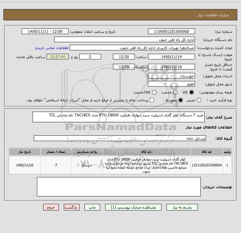 شرح کلی نیاز: خرید 7 دستگاه کولر گازی اسپلیت سرد دیواری ظرفیت 18000 BTU مدل TAC18CS نام تجارتی TCL