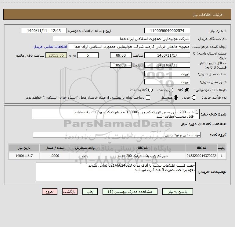 شرح کلی نیاز: شیر 200 سی سی تتراپک کم چرب 10000عدد -ایران کد جهت تشابه میباشد