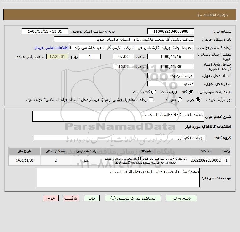 نام دستگاه خریدار:شرکت پالایش گاز شهید هاشمی نژاد استان خراسان رضوی