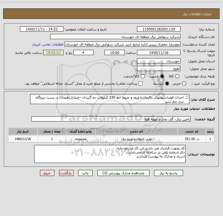 شرح کلی نیاز: احداث فونداسیونهای باقیمانده ورود و خروج خط 230 کیلوولت دو گنبدان –چنارشاهیجان در پست نیروگاه سد چم شیر