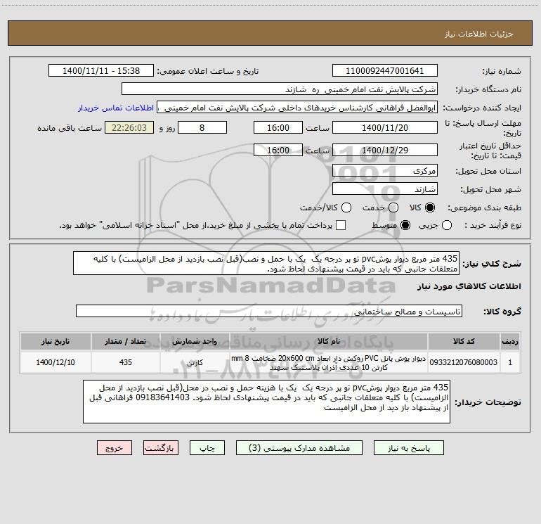 شرح کلی نیاز: 435 متر مربع دیوار پوشpvc تو پر درجه یک یک با حمل و نصب(قبل نصب بازدید از محل الزامیست) با کلیه متعلقات جانبی که باید در قیمت پیشنهادی لحاظ شود.