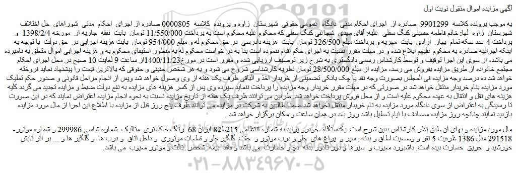 به موجب پرونده کلاسه  9901299  صادره از  اجرای احکام مدنی  دادگاه  عمومی حقوقی  شهرستان  زاوه و پرونده  کلاسه  0000805 صادره از اجرای  احکام  مدنی  شوراهای  حل اختلاف  شهرستان  زاوه  لها: خانم فاطمه حسینی کنگ سفلی  علیه: آقای مهدی  شجاعی کنگ سفلی که محکوم علیه محکوم است به پرداخت 11/550/000 تومان  بابت  نفقه  جاریه از  مورخه 1398/2/4  و پرداخت 4 عدد سکه تمام  بهار  ازادی  بابت  مهریه و پرداخت مبلغ 326/500 تومان  بابت  هزینه دادرسی  در حق محکوم له و مبلغ 954/000 تومان  بابت هزینه اجرایی در  حق دولت  با توجه به اینکه اجرائیه صادره به محکوم علیهم ابلاغ شده و در مهلت مقرر نسبت به اجرای حکم اقدام ننموده است بنا به در خواست محکوم له به منظور استیفای محکوم به و هزینه اجرایی اموال متعلق به نامبرده می باشد، از سوی این اجرا توقیف و توسط کارشناس رسمی دادگستری به شرح زیر توصیف ارزیابی شده و مقرر است در مورخ1400/11/23از ساعت 9 لغایت 10 صبح در محل اجرای احکام مجتمع خانواده از طریق مزایده بفروش می رسد، مزایده از مبلغ 28/500/000 تومان نظریه کارشناسی شروع می شود و به هر شخص حقیقی و حقوقی که بالاترین قیمت را پیشنهاد نماید فروخته خواهد شد ده درصد وجه مزایده فی المجلس بصورت وجه نقد یا چک بانکی تضمینی از خریدار اخذ و الباقی ظرف یک هفته از وی وصول خواهد شد وپس از انجام مراحل قانونی و صدور حکم تملیک مورد مزایده بنام خریدار منتقل خواهد شد در صورتی که در مهلت مقرر خریدار وجه مزایده را پرداخت ننماید سپرده وی پس از کسر هزینه های مزایده به نفع دولت ضبط و مزایده تجدید می گردد کلیه هزینه های نقل و انتقال به عهده محکوم علیه است و از محل فروش پرداخت خواهد شد. طرفین می توانند ظرف یک هفته از تاریخ مزایده نسبت به نحوه انجام مزایده اعتراض نمایند که در این صورت تا رسیدگی به اعتراض از سوی دادگاه مورد مزایده به نام خریدار منتقل نخواهد شد ضمنا طالبین به شرکت در مزایده می توانند ظرف پنج روز قبل از مزایده با اطلاع این اجرا از مال مورد مزایده بازدید نمایند چنانچه روز مزایده مصادف با ایام تعطیل باشد روز بعد در همان ساعت و مکان برگزار خواهد شد .