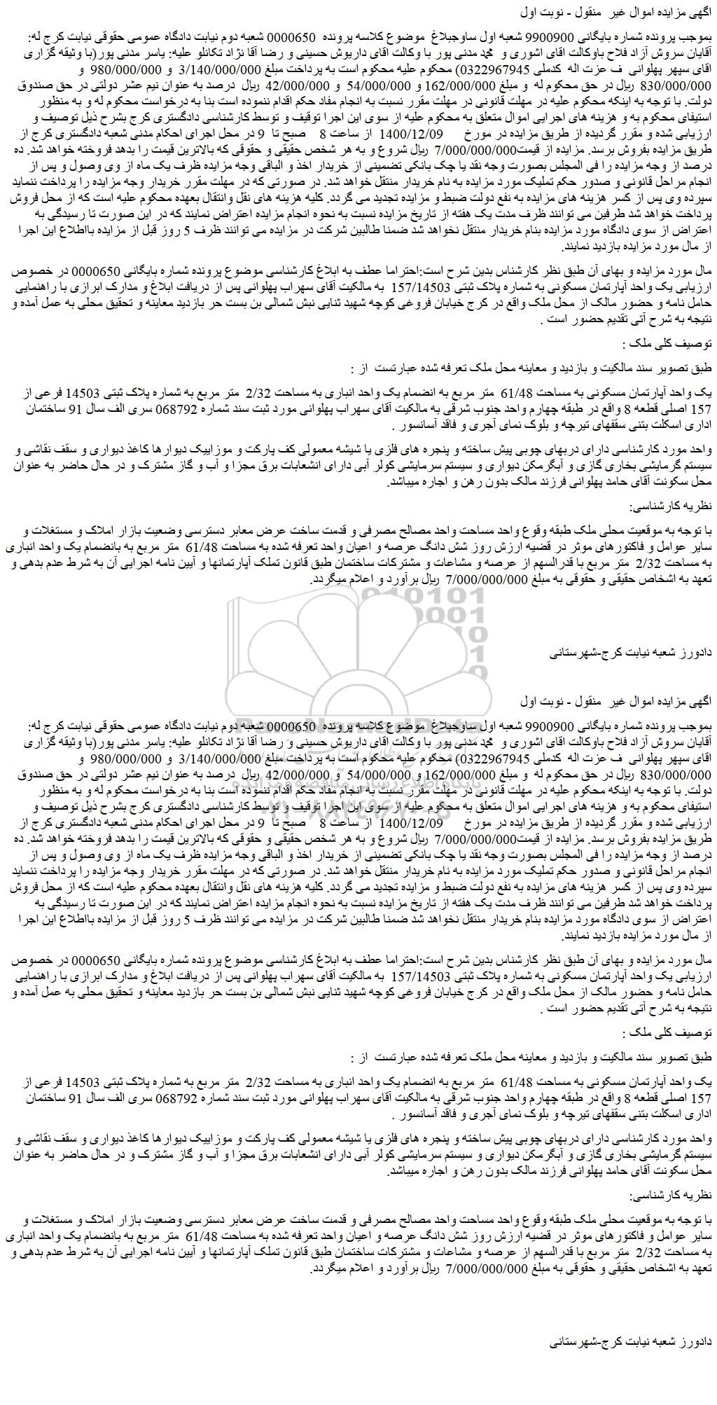 مزایده فروش یک واحد آپارتمان مسکونی به شماره پلاک ثبتی 157/14503 , مزایده فروش یک واحد آپارتمان مسکونی به شماره پلاک ثبتی 157/14503