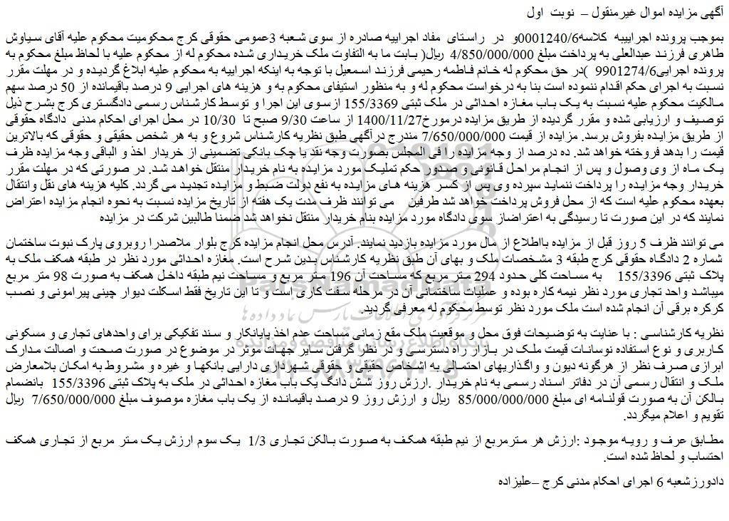 بموجب پرونده اجراییبه  کلاسه0001240/6و  در  راستای  مفاد اجراییه صادره از سوی شعبه 3عمومی حقوقی کرج محکومیت محکوم علیه آقای سیاوش طاهری فرزند عبدالعلی به پرداخت مبلغ 4/850/000/000  ریال( بابت ما به التفاوت ملک خریداری شده محکوم له از محکوم علیه با لحاظ مبلغ محکوم به پرونده اجرایی9901274/6  )در حق محکوم له خانم فاطمه رحیمی فرزند اسمعیل با توجه به اینکه اجراییه به محکوم علیه ابلاغ گردیده و در مهلت مقرر نسبت به اجرای حکم اقدام ننموده است بنا به درخواست محکوم له و به منظور استیفای محکوم به و هزینه های اجرایی 9 درصد باقیمانده از 50 درصد سهم مالکیت محکوم علیه نسبت به یک باب مغازه احداثی در ملک ثبتی 155/3369 ازسوی این اجرا و توسط کارشناس رسمی دادگستری کرج بشرح ذیل توصیف و ارزیابی شده و مقرر گردیده از طریق مزایده درمورخ1400/11/27 از ساعت 9/30 صبح تا  10/30 در محل اجرای احکام مدنی  دادگاه حقوقی از طریق مزایده بفروش برسد. مزایده از قیمت 7/650/000/000 مندرج درآگهی طبق نظریه کارشناس شروع و به هر شخص حقیقی و حقوقی که بالاترین قیمت را بدهد فروخته خواهد شد. ده درصد از وجه مزایده را فی المجلس بصورت وجه نقد یا چک بانکی تضمینی از خریدار اخذ و الباقی وجه مزایده ظرف یک ماه از وی وصول و پس از انجام مراحل قانونی و صدور حکم تملیک مورد مزایده به نام خریدار منتقل خواهد شد. در صورتی که در مهلت مقرر خریدار وجه مزایده را پرداخت ننماید سپرده وی پس از کسر هزینه های مزایده به نفع دولت ضبط و مزایده تجدید می گردد. کلیه هزینه های نقل وانتقال بعهده محکوم علیه است که از محل فروش پرداخت خواهد شد طرفین    می توانند ظرف مدت یک هفته از تاریخ مزایده نسبت به نحوه انجام مزایده اعتراض نمایند که در این صورت تا رسیدگی به اعتراضاز سوی دادگاه مورد مزایده بنام خریدار منتقل نخواهد شد ضمنا طالبین شرکت در مزایده