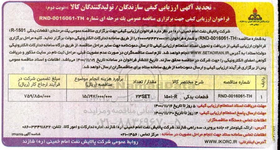 تجدید مناقصه قطعات یدکی R-1501 - نوبت دوم, تجدید مناقصه قطعات یدکی R-1501 - نوبت دوم