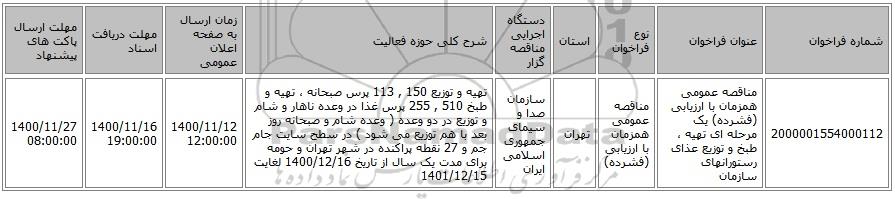 | 2000001554000112 | مناقصه عمومی همزمان با ارزیابی (فشرده) یک مرحله ای تهیه ، طبخ و توزیع عذای رستورانهای سازمان | مناقصه عمومی همزمان با ارزیابی (فشرده) | تهران | سازمان صدا و سیمای جمهوری اسلامی ایران | تهیه و توزیع 150 , 113 پرس صبحانه ، تهیه و طبخ 510 , 255 پرس غذا در وعده ناهار و شام و توزیع در دو وعده ( وعده شام و صبحانه روز بعد با هم توزیع می شود ) در سطح سایت جام جم و 27 نقطه پراکنده در شهر تهران و حومه برای مدت یک سال از تاریخ 1400/12/16 لغایت 1401/12/15 | 1400/11/12 12:00:00 | 1400/11/16 19:00:00 | 1400/11/27 08:00:00 |