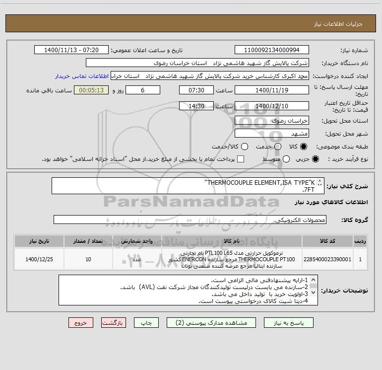نام دستگاه خریدار:شرکت پالایش گاز شهید هاشمی نژاد استان خراسان رضوی