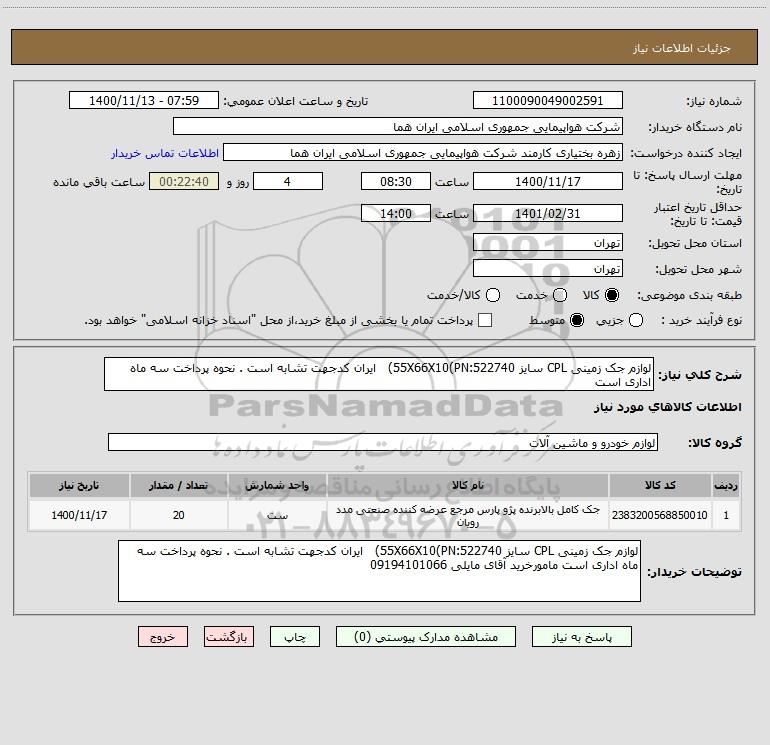 شرح کلی نیاز: لوازم جک زمینی CPL سایز 55X66X10(PN:522740) ایران کدجهت تشابه است . نحوه پرداخت سه ماه اداری است