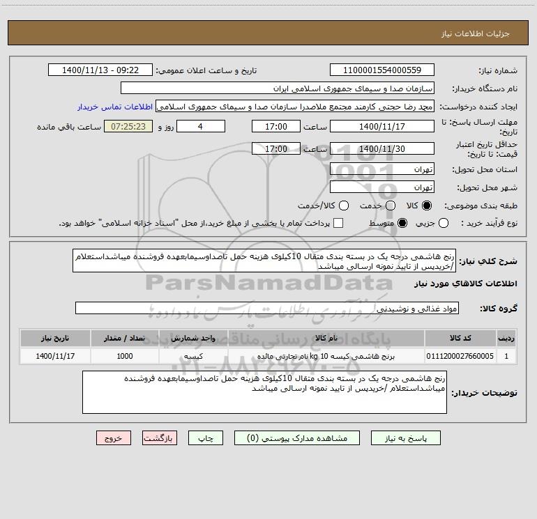 شرح کلی نیاز: رنج هاشمی درجه یک در بسته بندی متقال 10کیلوی هزینه حمل تاصداوسیمابعهده فروشنده میباشداستعلام /خریدپس از تایید نمونه ارسالی میباشد