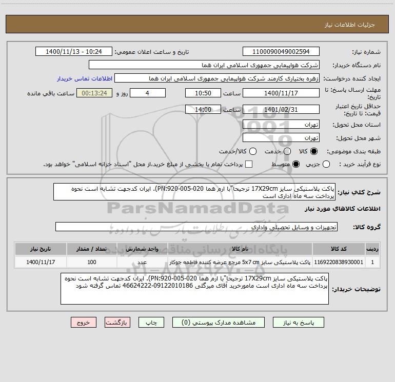 شرح کلی نیاز: پاکت پلاستیکی سایز 17X29cm ترجیحا"با ارم هما PN:920-005-020). ایران کدجهت تشابه است نحوه پرداخت سه ماه اداری است