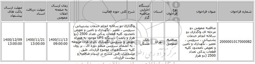 2000001017000082 | مناقصه عمومی دو مرحله ای واگذاری دو سالانه انجام خدمات پشتیبانی ، سرویس ، تعمیر ، نگهداری و تامین و تعویض نامحدود کلیه قطعات یدکی تعداد 2500 (دو هزار | مناقصه عمومی | تهران | بانک مسکن | واگذاری دو سالانه انجام خدمات پشتیبانی ، سرویس ، تعمیر ، نگهداری و تامین و تعویض نامحدود کلیه قطعات یدکی تعداد 2500 (دو هزار و پانصد) دستگاه UPS موجود به همراه تعویض و سرویس نگهداری باتری های مربوطه ، به انضمام سرویس منظم دوره ای ، بر روی کلیه دستگاههای موضوع قرارداد. طبق مشخصات فنی مندرج در اسناد مناقصه و پیوست قرارداد. | 1400/11/13 09:00:00 | 1400/11/21 13:00:00 | 1400/12/09 13:00:00 |