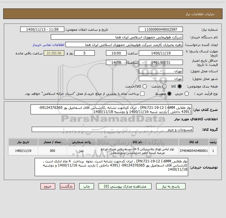 شرح کلی نیاز: نوار طلایی PN:721-19-12 (-6MM) . ایران کدجهت تشابه ,کارشناس آقای اسماعیل پور 09124376365- (4391 داخلی ) بازدید شنبه 1400/11/16 و دوشنبه 1400/11/18