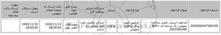 مناقصه، فراخوان ارزیابی کیفی مناقصه عمومی یک مرحله ای :RNP-0051060-MD از کلیه افراد متخصص و شرکتها واجد شرایط دعوت به عمل میآید در مناقصه با کد خبرگزاری پارس نماد: 4224006 شرکت نمایند.