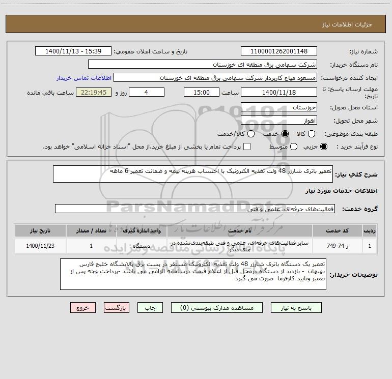 شرح کلی نیاز: تعمیر باتری شارژر 48 ولت تغذیه الکترونیک با احتساب هزینه بیمه و ضمانت تعمیر 6 ماهه