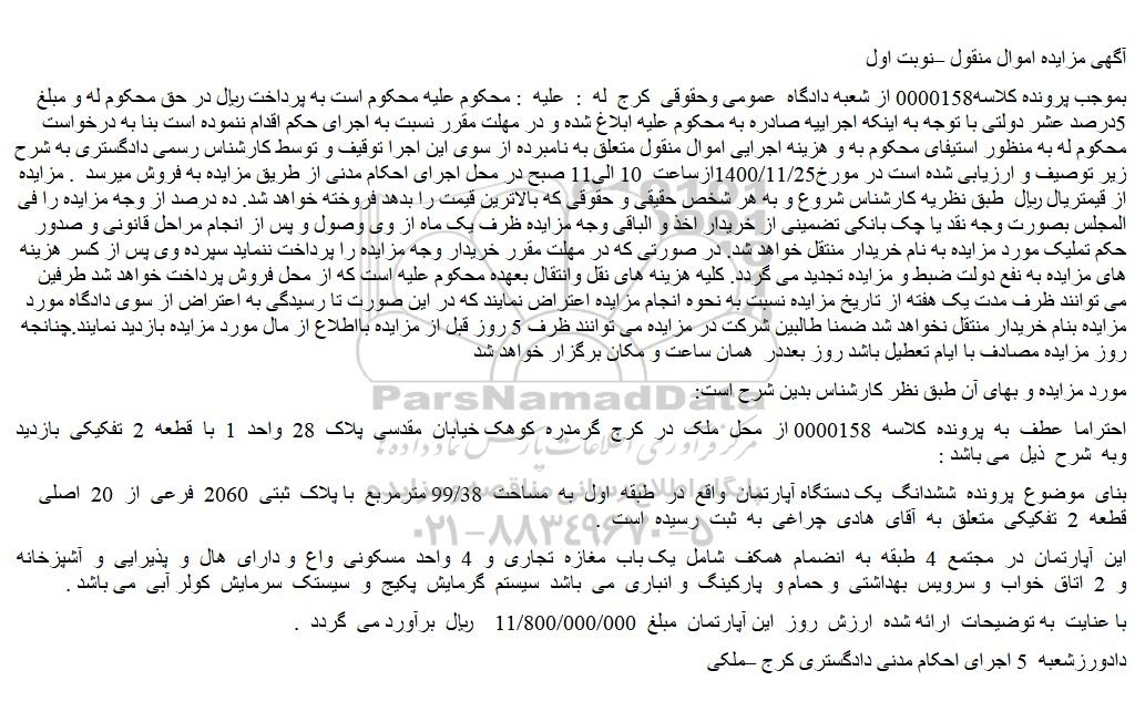 بموجب پرونده کلاسه0000158 از شعبه دادگاه  عمومی وحقوقی  کرج  له  :  علیه  : محکوم علیه محکوم است به پرداخت ریال در حق محکوم له و مبلغ 5درصد عشر دولتی با توجه به اینکه اجراییه صادره به محکوم علیه ابلاغ شده و در مهلت مقرر نسبت به اجرای حکم اقدام ننموده است بنا به درخواست محکوم له به منظور استیفای محکوم به و هزینه اجرایی اموال منقول متعلق به نامبرده از سوی این اجرا توقیف و توسط کارشناس رسمی دادگستری به شرح زیر توصیف و ارزیابی شده است در مورخ1400/11/25ازساعت  10 الی11 صبح در محل اجرای احکام مدنی از طریق مزایده به فروش میرسد  . مزایده از قیمتریال ریال  طبق نظریه کارشناس شروع و به هر شخص حقیقی و حقوقی که بالاترین قیمت را بدهد فروخته خواهد شد. ده درصد از وجه مزایده را فی المجلس بصورت وجه نقد یا چک بانکی تضمینی از خریدار اخذ و الباقی وجه مزایده ظرف یک ماه از وی وصول و پس از انجام مراحل قانونی و صدور حکم تملیک مورد مزایده به نام خریدار منتقل خواهد شد. در صورتی که در مهلت مقرر خریدار وجه مزایده را پرداخت ننماید سپرده وی پس از کسر هزینه های مزایده به نفع دولت ضبط و مزایده تجدید می گردد. کلیه هزینه های نقل وانتقال بعهده محکوم علیه است که از محل فروش پرداخت خواهد شد طرفین    می توانند ظرف مدت یک هفته از تاریخ مزایده نسبت به نحوه انجام مزایده اعتراض نمایند که در این صورت تا رسیدگی به اعتراض از سوی دادگاه مورد مزایده بنام خریدار منتقل نخواهد شد ضمنا طالبین شرکت در مزایده می توانند ظرف 5 روز قبل از مزایده بااطلاع از مال مورد مزایده بازدید نمایند.چنانجه روز مزایده مصادف با ایام تعطیل باشد روز بعددر  همان ساعت و مکان برگزار خواهد شد