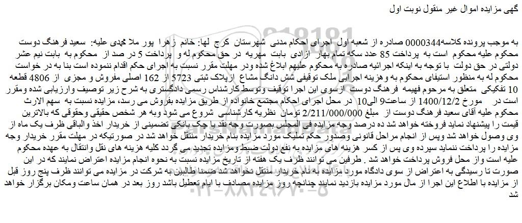 به موجب پرونده کلاسه0000344 صادره از شعبه اول اجرای احکام مدنی شهرستان کرج لها: خانم زهرا پور ملا محمدی علیه: سعید فرهنگ دوست محکوم علیه محکوم است به پرداخت 85 عدد سکه تمام بهار ازادی بابت مهریه در حق محکوم له و پرداخت 5 در صد از محکوم به بابت نیم عشر دولتی در حق دولت با توجه به اینکه اجرائیه صادره به محکوم علیهم ابلاغ شده ودر مهلت مقرر نسبت به اجرای حکم اقدام ننموده است بنا به در خواست محکوم له به منظور استیفای محکوم به وهزینه اجرایی ملک توقیفی شش دانگ مشاع ازپلاک ثبتی 5723 از 162 اصلی مفروش و مجزی از 4806 قطعه 10 تفکیکی متعلق به مرحوم فهیمه فرهنگ دوست ازسوی این اجرا توقیف وتوسط کارشناس رسمی دادگستری به شرح زیر توصیف وارزیابی شده ومقرر است در مورخ 1400/12/2 از ساعت9 الی10 در محل اجرای احکام مجتمع خانواده از طریق مزایده بفروش می رسد، مزایده نسبت به سهم الارث محکوم علیه آقای سعید فرهنگ دوست از مبلغ 2/211/000/000 تومان نظریه کارشناسی شروع می شود وبه هر شخص حقیقی وحقوقی که بالاترین قیمت را پیشنهاد نماید فروخته خواهد شد ده درصد وجه مزایده فی المجلس بصورت وجه نقد یا چک بانکی تضمینی از خریدار اخذ والباقی ظرف یک ماه از وی وصول خواهد شد وپس از انجام مراحل قانونی وصدور حکم تملیک مورد مزایده بنام خریدار منتقل خواهد شد در صورتیکه در مهلت مقرر خریدار وجه مزایده را پرداخت ننماید سپرده وی پس از کسر هزینه های مزایده به نفع دولت ضبط ومزایده تجدید می گردد کلیه هزینه های نقل وانتقال به عهده محکوم علیه است واز محل فروش پرداخت خواهد شد . طرفین می توانند ظرف یک هفته از تاریخ مزایده نسبت به نحوه انجام مزایده اعتراض نمایند که در این صورت تا رسیدگی به اعتراض از سوی دادگاه مورد مزایده به نام خریدار منتقل نخواهد شد ضمنا طالبین به شرکت در مزایده می توانند ظرف پنج روز قبل از مزایده با اطلاع این اجرا از مال مورد مزایده بازدید نمایند چنانچه روز مزایده مصادف با ایام تعطیل باشد روز بعد در همان ساعت ومکان برگزار خواهد شد