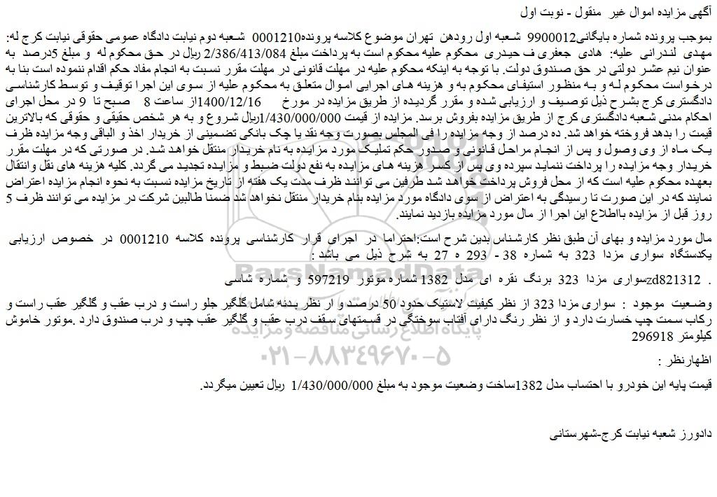 مال مورد مزایده و بهای آن طبق نظر کارشناس بدین شرح است:احتراما در اجرای قرار کارشناسی پرونده کلاسه 0001210 در خصوص ارزیابی یکدستگاه سواری مزدا 323 به شماره 38 - 293 ه 27 به شرح ذیل می باشد :