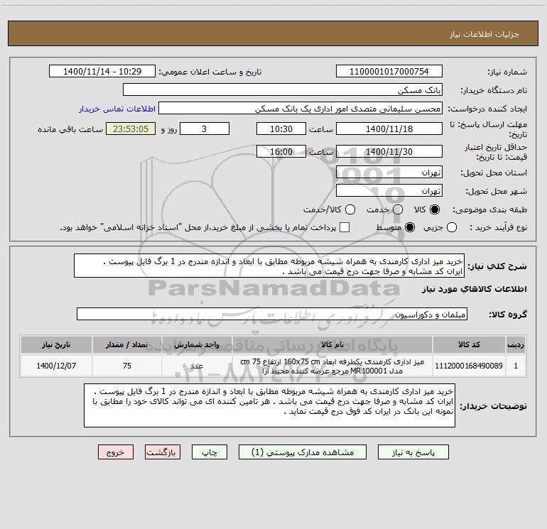 توضیحات خریدار:خرید میز اداری کارمندی به همراه شیشه مربوطه مطابق با ابعاد و اندازه مندرج در 1 برگ فایل پیوست . ایران کد مشابه و صرفا جهت درج قیمت می باشد . هر تامین کننده ای می تواند کالای خود را مطابق با نمونه این بانک در ایران کد فوق درج قیمت نماید .