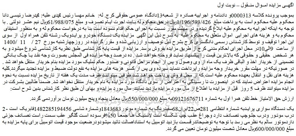 بموجب پرونده کلاسه 0000313و دادنامه و اجراییه صادره از شعبه13دادگاه عمومی حقوقی کرج. له: خانم مهسا رئیس محمدی علیه: محمدرضا رئیسی دانا محکوم علیه محکوم است به پرداخت مبلغ 1/196/593/426ریال درحق محکوم له بابت اجرت ایام تصرف و مبلغ 61/988/075ریال نیم عشر دولتی . با توجه به اینکه اجراییه به محکوم علیه ابلاغ گردیده و در مهلت مقرر نسبت به اجرای حکم اقدام ننموده است بنا به درخواست محکوم له و به منظور استیفای محکوم به و هزینه های اجرایی اموال متعلق به محکوم علیه به شرح ذیل این اگهی مزایده یک دستگاه خودرو پرایدویک رشته تلفن همراه اول از سوی این اجرا توقیف و توسط کارشناس رسمی دادگستری کرج بشرح ذیل توصیف و ارزیابی شده و مقرر گردیده در روزچهارشنبه مورخ 27 / 11 /1400 از ساعت 9الی10در محل اجرای احکام مدنی کرج از طریق مزایده بفروش برسد. مزایده از قیمت پایه کارشناسی طبق نظریه کارشناسی شروع میشود و به هر شخص حقیقی و حقوقی که بالاترین قیمت را پیشنهاد نماید فروخته خواهد شد . ده درصد وجه مزایده فی المجلس بصورت وجه نقد یا چک بانکی تضمینی از خریدار اخذ و الباقی ظرف یک ماه از وی وصول و پس از انجام مراحل قانونی و صدور حکم تملیک مورد مزایده بنام خریدار منتقل خواهد شد . در صورتیکه در مهلت مقرر خریدار وجه مزایده راپرداخت ننماید سپرده وی پس از کسر هزینه های مزایده به نفع دولت ضبط و مزایده تجدید میگردد.کلیه هزینه های نقل و انتقال بعهده محکوم علیه است.که از محل فروش پرداخت خواهد شد.طرفین میتوانند ظرف مدت یک هفته از تاریخ مزایده نسبت به نحوه انجام مزایده اعتراض نمایند که در اینصورت تا رسیدگی به اعتراض از سوی دادگاه مورد مزایده به نام خریدار منتقل نخواهد شد. ضمناً طالبین بشرکت در مزایده میتوانند ظرف 5 روز قبل از مزایده با اطلاع از مال مورد مزایده بازدید نمایند. مال مورد مزایده و بهای آن طبق نظر کارشناس بدین شرح است: