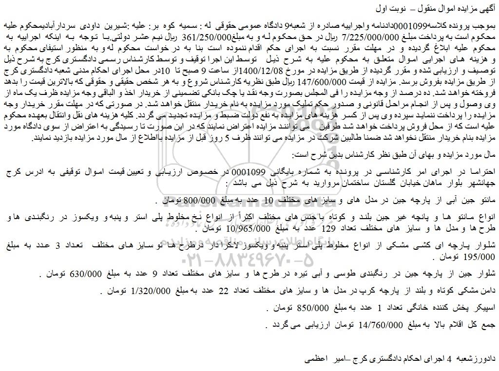 بموجب پرونده کلاسه0001099دادنامه واجراییه صادره از شعبه9 دادگاه عمومی حقوقی  له : سمیه  کوه  بر: علیه :شیرین  داودی  سردارآبادیمحکوم علیه محکوم است به پرداخت مبلغ 7/225/000/000  ریال در حق محکوم له و به مبلغ361/250/000  ریال نیم عشر دولتی.با  توجه  به  اینکه  اجراییه  به  محکوم  علیه  ابلاغ  گردیده  و  در  مهلت  مقرر  نسبت  به  اجرای  حکم  اقدام ننموده  است  بنا  به  در خواست  محکوم  له و به  منظور استیفای محکوم  به و هزینه  های  اجرایی  اموال  متعلق  به  محکوم  علیه  به  شرح  ذیل    توسط این اجرا توقیف و توسط کارشناس رسمی دادگستری کرج به شرح ذیل توصیف و ارزیابی شده و مقرر گردیده از طریق مزایده در مورخ 1400/12/08از ساعت 9 صبح تا  10در محل اجرای احکام مدنی شعبه دادگستری کرج از طریق مزایده بفروش برسد. مزایده از قیمت 147/600/000 ریال طبق نظریه کارشناس شروع و به هر شخص حقیقی و حقوقی که بالاترین قیمت را بدهد فروخته خواهد شد. ده درصد از وجه مزایده را فی المجلس بصورت وجه نقد یا چک بانکی تضمینی از خریدار اخذ و الباقی وجه مزایده ظرف یک ماه از وی وصول و پس از انجام مراحل قانونی و صدور حکم تملیک مورد مزایده به نام خریدار منتقل خواهد شد. در صورتی که در مهلت مقرر خریدار وجه مزایده را پرداخت ننماید سپرده وی پس از کسر هزینه های مزایده به نفع دولت ضبط و مزایده تجدید می گردد. کلیه هزینه های نقل وانتقال بعهده محکوم علیه است که از محل فروش پرداخت خواهد شد طرفین    می توانند مزایده اعتراض نمایند که در این صورت تا رسیدگی به اعتراض از سوی دادگاه مورد مزایده بنام خریدار منتقل نخواهد شد ضمنا طالبین شرکت در مزایده می توانند ظرف 5 روز قبل از مزایده بااطلاع از مال مورد مزایده بازدید نمایند.
