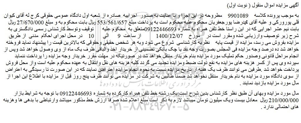 به موجب پرونده کلاسه    9901089    مطروحه در این اجرا و با عنایت به صدور  اجراییه  صادره از شعبه اول دادگاه عمومی حقوقی کرج له آقای کیوان قلی پورورکی و علیه آقای محمدرضا پورجعفریان محکوم علیه محکوم است به پرداخت مبلغ 553/561/657 ریال بابت محکوم به و مبلغ 27/670/000 ریال بابت نیم عشر اجرایی که در این راستا خط تلفن همراه به شماره 09122446693متعلق به  محکوم علیه      توقیف وتوسط کارشناس رسمی دادگستری به شرح زیر توصیف وارزیابی شده ومقرر است در    مورخ    1400/12/07          از ساعت  9      الی      10    در محل اجرای احکام  مدنی  از طریق مزایده بفروش می رسد، مزایده از قیمت پایه    نظریه کارشناسی  شروع می شود وبه هر شخص حقیقی وحقوقی که بالاترین قیمت را پیشنهاد نماید فروخته خواهد شد ده درصد وجه مزایده فی المجلس بصورت وجه نقد یا چک بانکی تضمینی از خریدار اخذ والباقی ظرف یک ماه از وی وصول خواهد شد وپس از انجام مراحل قانونی وصدور حکم تملیک مورد مزایده بنام خریدار منتقل خواهد شد در صورتیکه در مهلت مقرر خریدار وجه مزایده را پرداخت ننماید سپرده وی پس از کسر هزینه های مزایده به نفع دولت ضبط ومزایده تجدید می گردد کلیه هزینه های نقل وانتقال به عهده محکوم علیه است واز محل فروش پرداخت خواهد شد .طرفین می توانند ظرف یک هفته از تاریخ مزایده نسبت به نحوه انجام مزایده اعتراض نمایند که در این صورت تا رسیدگی به اعتراض از سوی دادگاه مورد مزایده به نام خریدار منتقل نخواهد شد ضمنا طالبین به شرکت در مزایده می توانند ظرف پنج روز قبل از مزایده با اطلاع این اجرا از مال مورد مزایده بازدید نمایند .